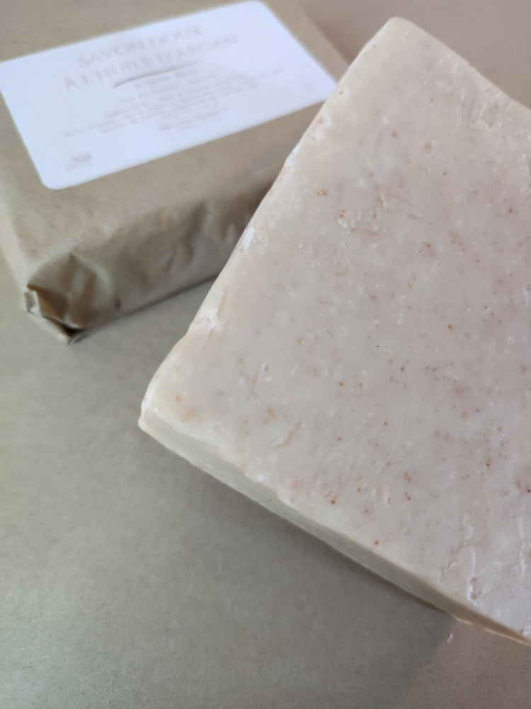 Huile d’argan, huile d’olive, huile de ricin, huile de coco, beurre de karité, hydroxyde de sodium, eau