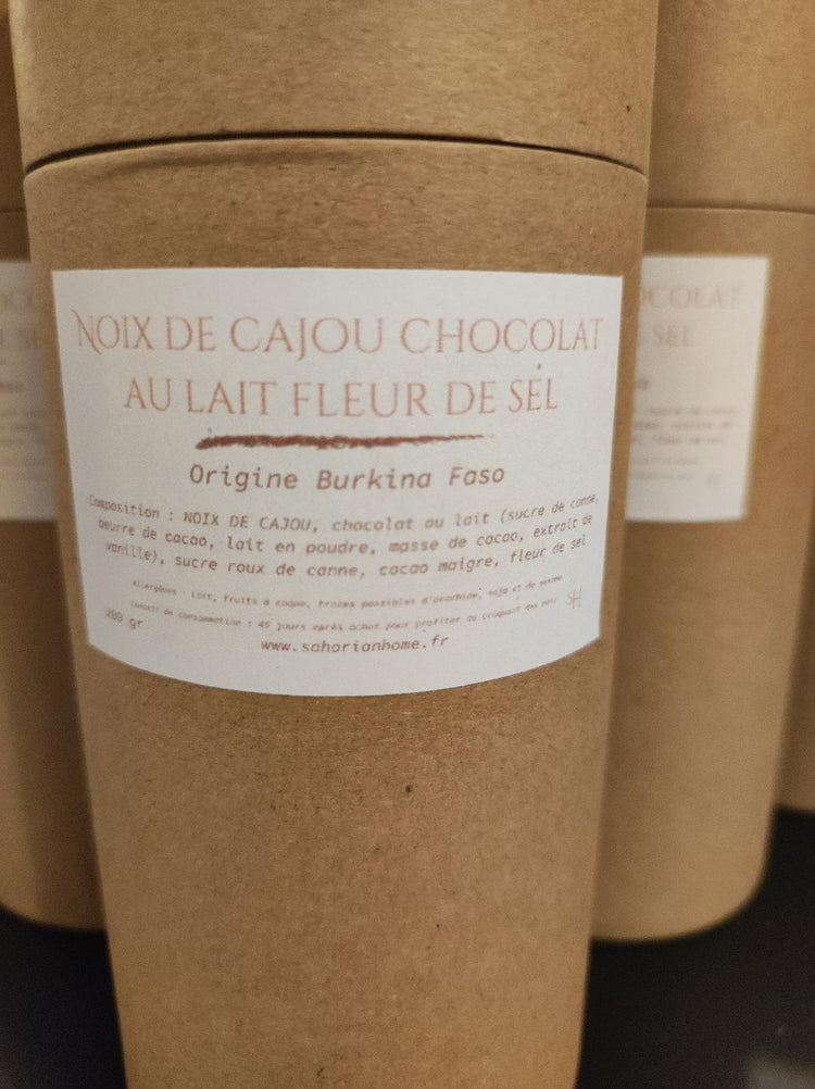 Ces noix de cajou sont d'abord enrobées d’une fine couche de caramel au sucre de canne puis de chocolat au lait pour la gourmandise. Enfin, une pointe de fleur de sel y est ajoutée.