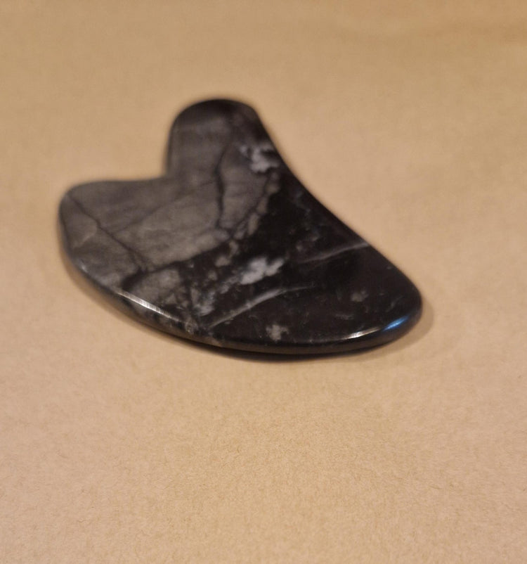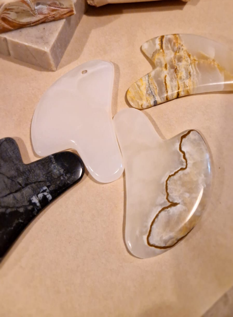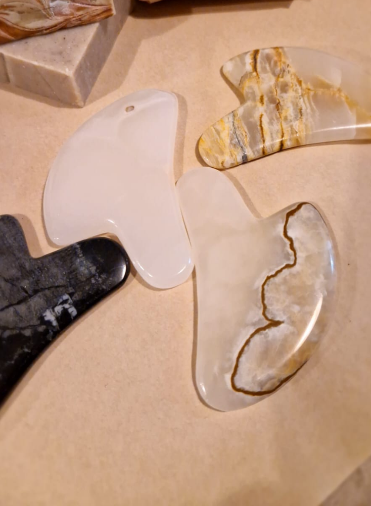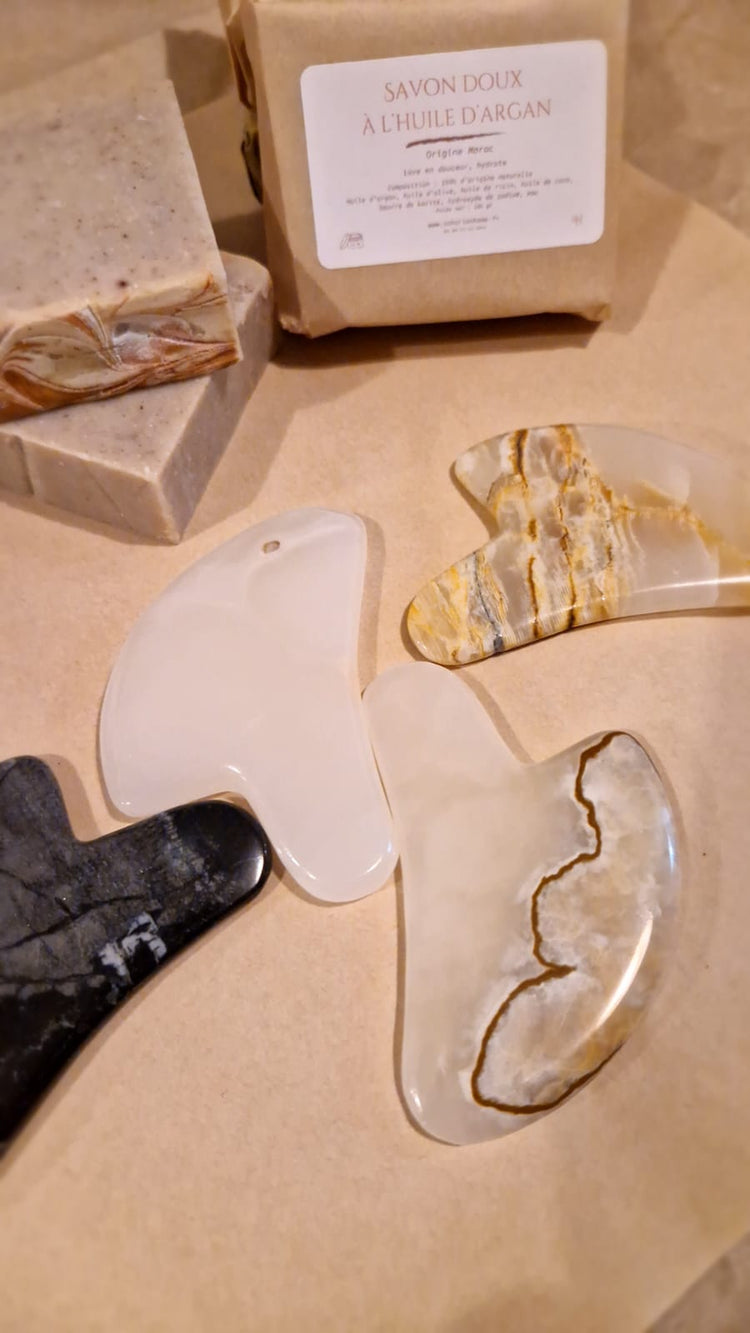 Après avoir nettoyé votre visage et appliqué votre beurre ou huile, passer la pierre presque à plat contre votre peau, sans mettre trop de pression (3 à 10 fois pour chaque geste).
